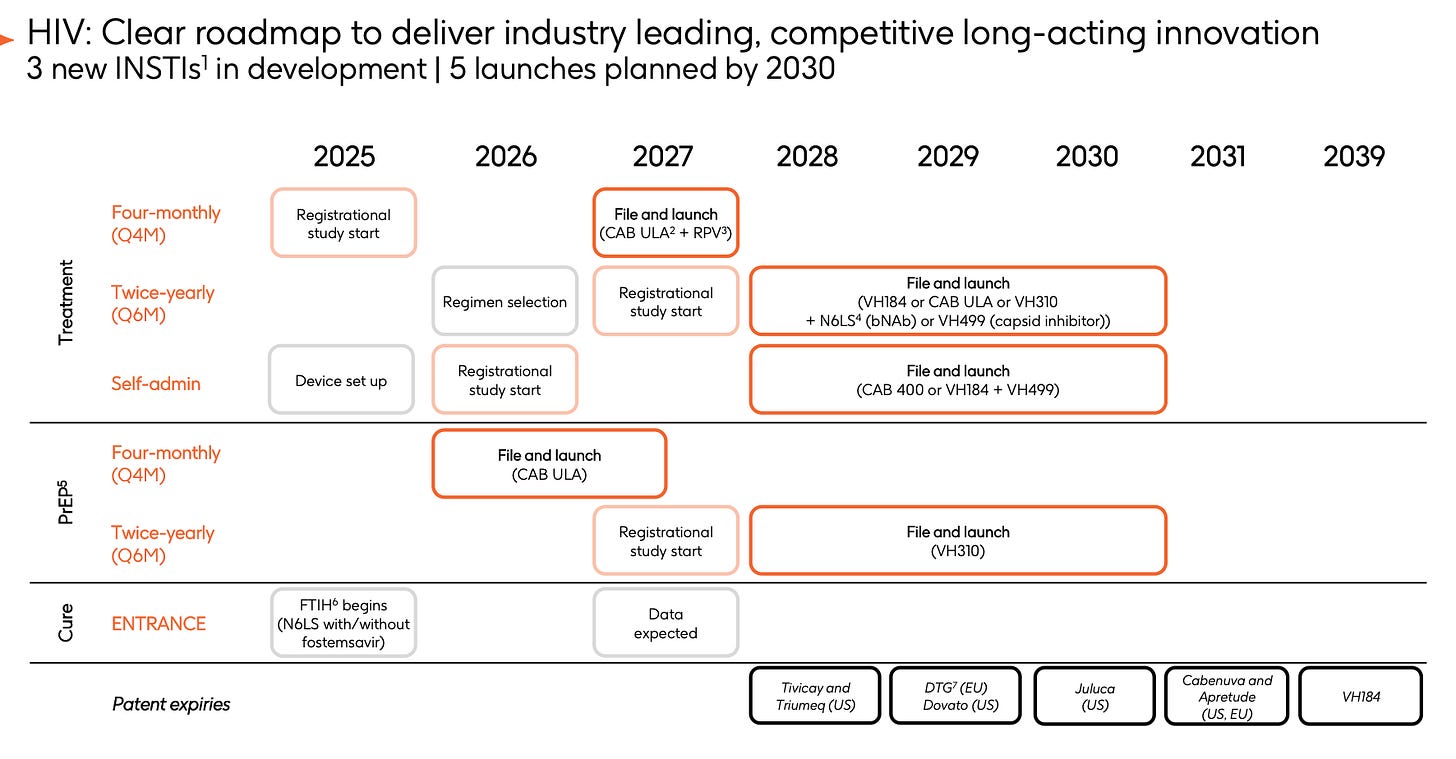 The thing that tends to worry investors most at the moment is expiry of some HIV patents between 2028-2031, accounting for almost 25% of revenue. For their part, GSK maintain they’ll be able to “significantly replace” lost revenue through launching increasingly long-acting treatments. By the end of the decade GSK will have a once every six months injection on the market and it seems likely to become the standard of care - even if the adoption curve isn’t fast enough to immediately offset the LOEs3.