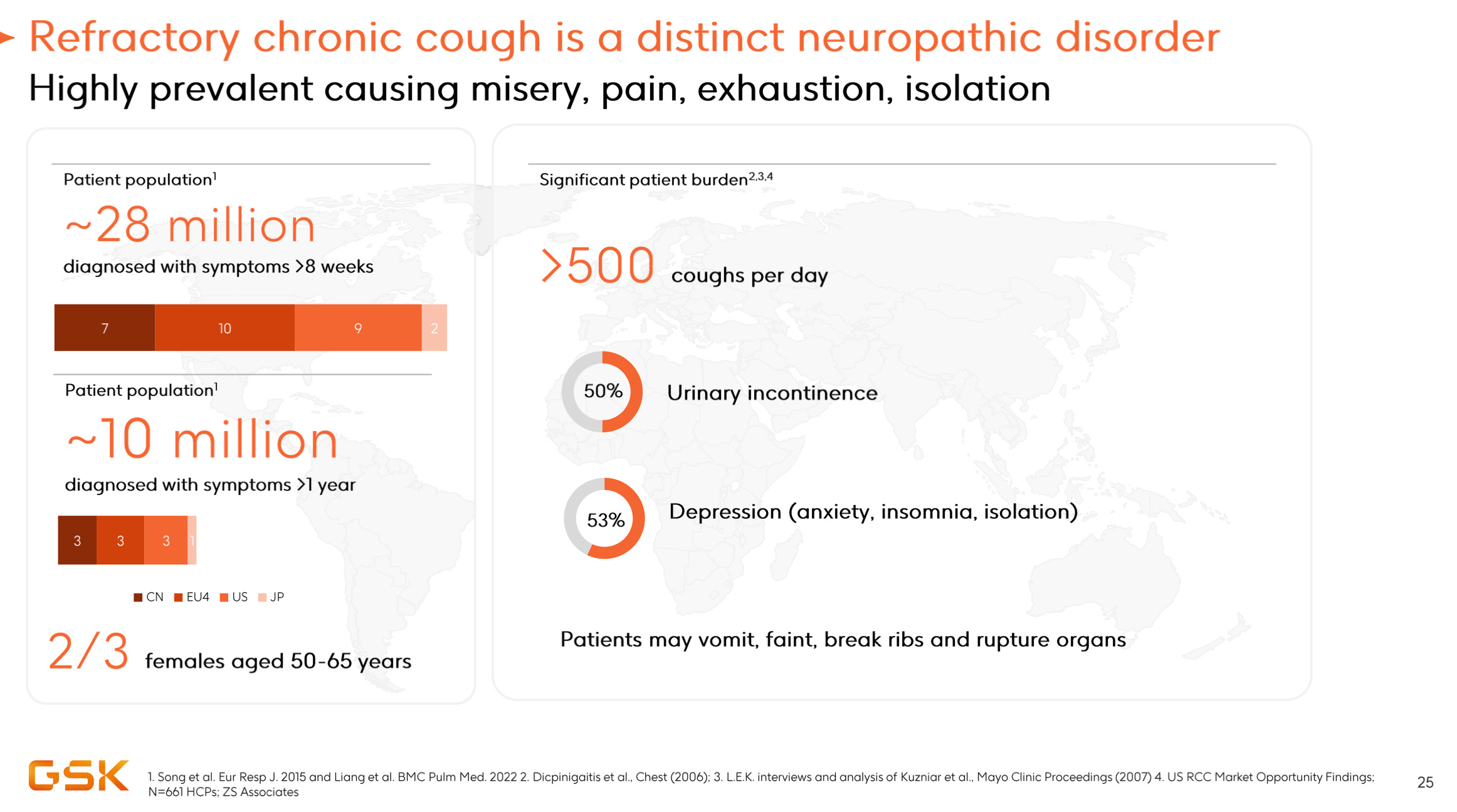 Refractory Chronic Cough: a patient population of 10m+ where there are currently no approved targeted therapies. Camlipixant has so far shown a 34% placebo-adjusted reduction in cough frequency and without the taste-related discontinuations suffered by a competitor. GSK PYS >£2.5bn.