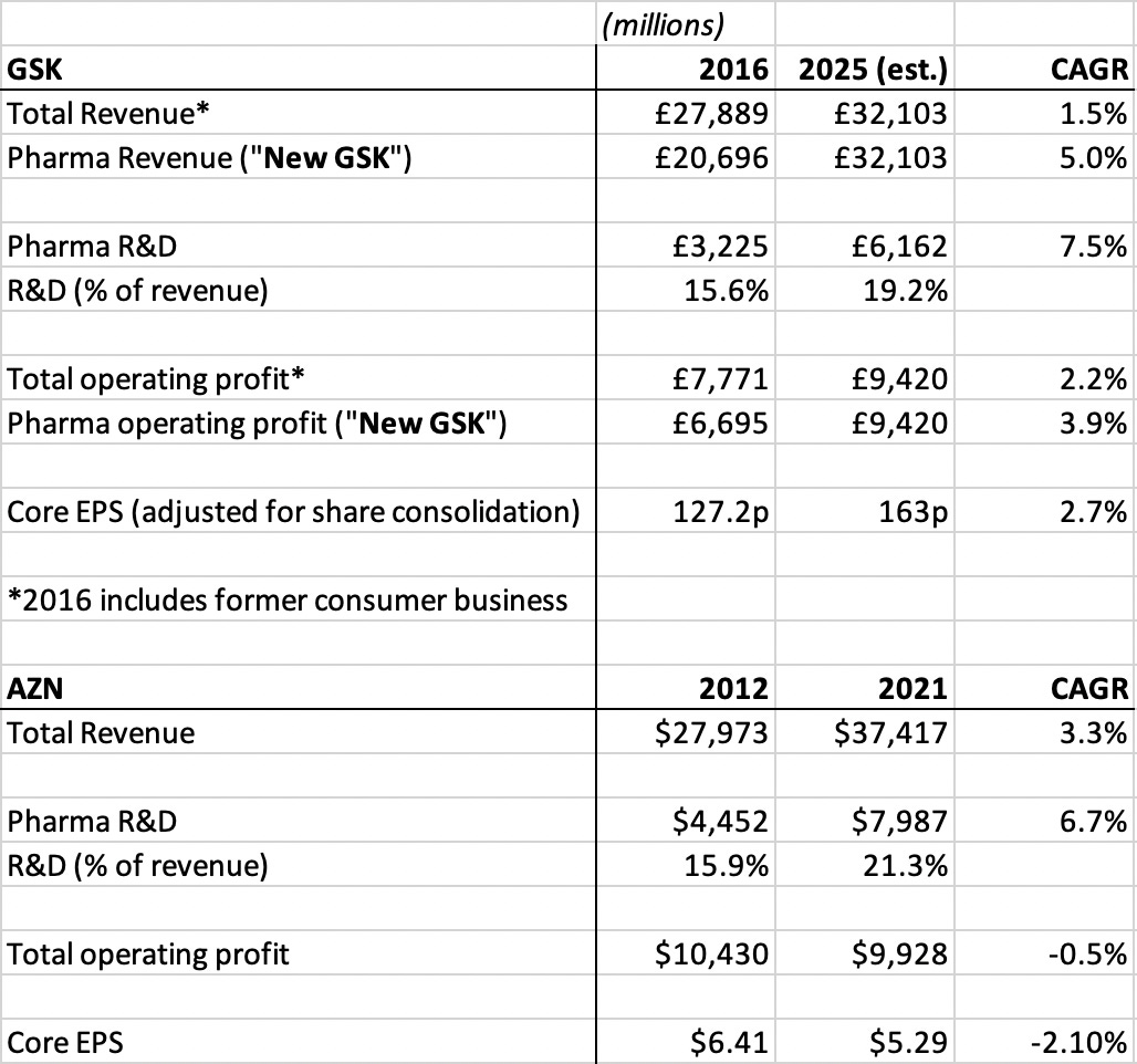 Naturally, GSK gets compared to AstraZeneca (AZN). AZN, of course, had its own R&D turnaround starting 4-5 years earlier under the leadership of Pascal Soriot. So let’s compare what happened in the following 9 years after each turnaround got underway: