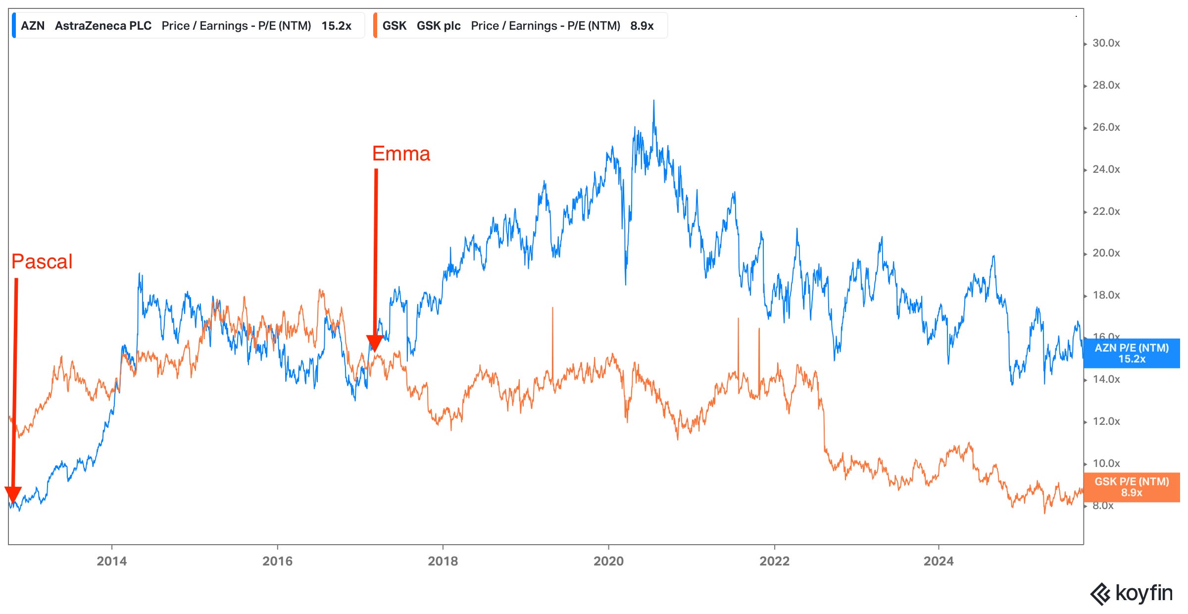 Much of the media coverage on GSK focusses on the fact that the shares haven’t gone anywhere under Emma’s nine years of leadership. This is, of course, true. But does it, of itself, make her leadership a failure? We’ll look at some of the context around this and try to shed a little light.