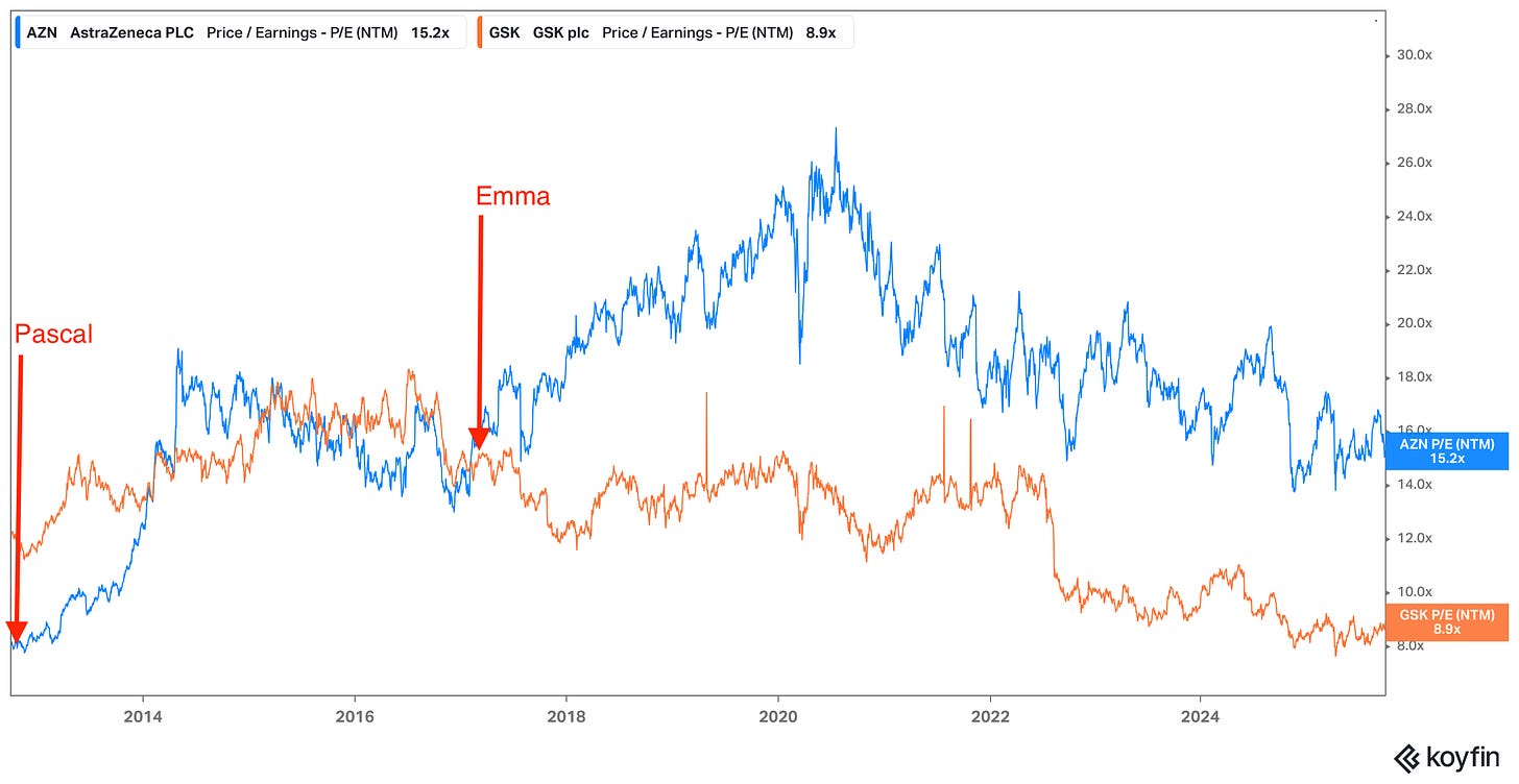 AZN started at ~8x P/E and finished near 22x in 2021. Whereas GSK started at ~15x in 2017 and finished around 8.5x before the leadership announcement this week. Soriot has unquestionably done amazingly well at AZN and started with a steep patent cliff, but on the other hand he had more to work with on the R&D side - for example, Tagrisso, Farxiga and Imfinzi (AZN’s biggest sellers today) were already in development. Other than Shingrix, there wasn’t really anything like this on the books at GSK when Walsmely started as CEO (that we know of). Similarly, Soriot was somewhat less constrained by debt.
