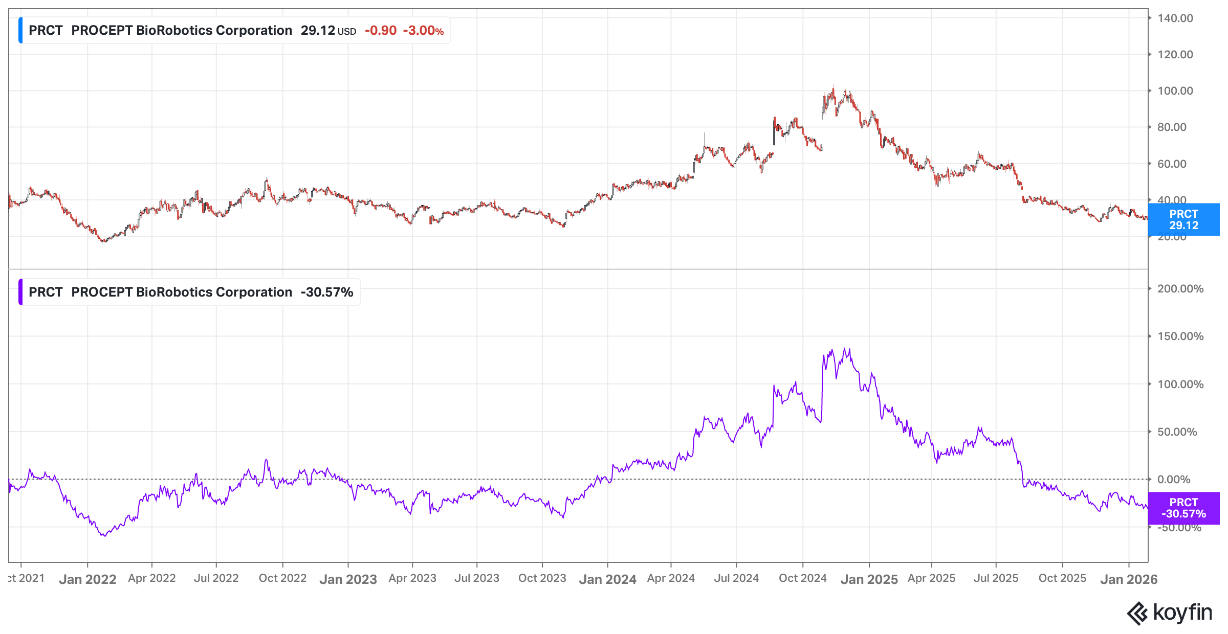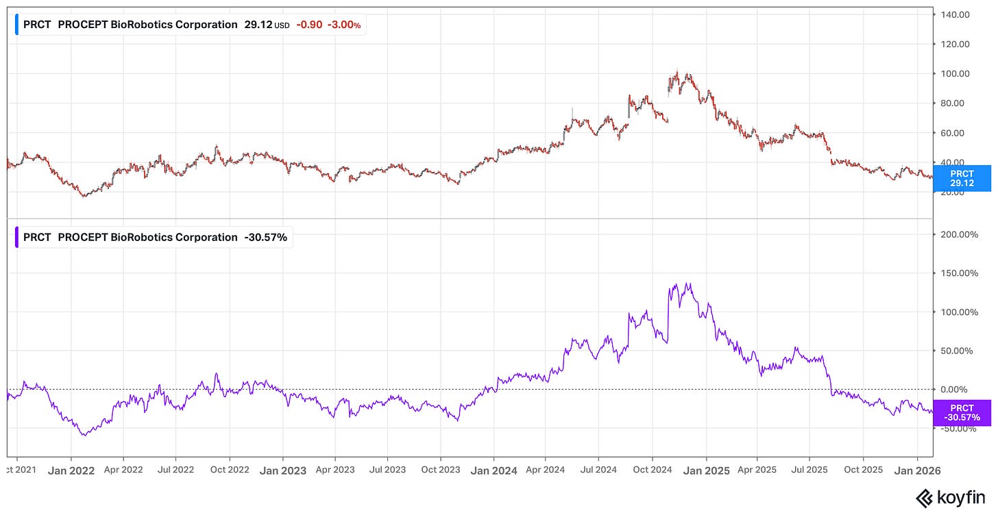 Technically PRCT’s system is a robot and, yes, one that uses AI. The business has been on a trajectory of rapid growth, with revenue for 2025 due to come in around 9.5 times higher than at the time of IPO in 2021. Rapid growth, robots, AI - you’d think these conditions would be ripe for investor enthusiasm. And you’d be right. Following a successful follow-on share issue in late 2024, PRCT investors could scarcely be more excited until just over a year ago. But over the course of 2025 PRCT stock quickly reversed to such an extent where anyone making the bull case risks looking silly.