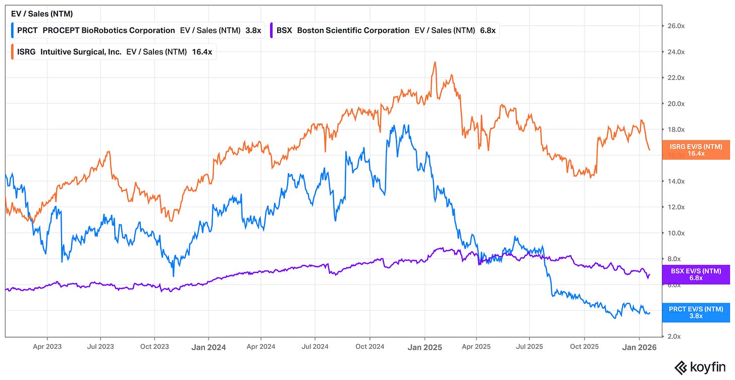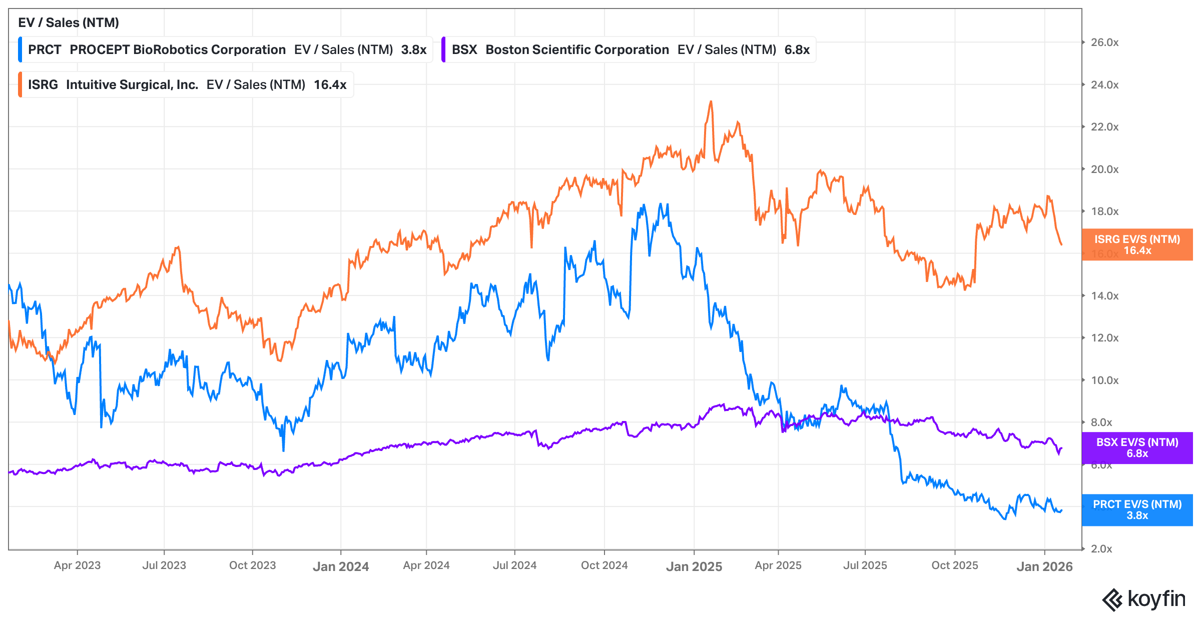 I have included Intuitive Surgical (ISRG) here simply as the largest, most obvious and most successful robotic surgery comparator.1 I have also included Boston Scientific (BSX) as a second comparator. I suspect that PRCT might be acquired before we get a chance to see the story play out - BSX is perhaps the most logical acquirer as a large medtech that operates in the same general space as PRCT. In 2026 PRCT is expected to grow about twice as fast as ISRG and three times as fast as BSX - just to give you a relative sense of where things are.