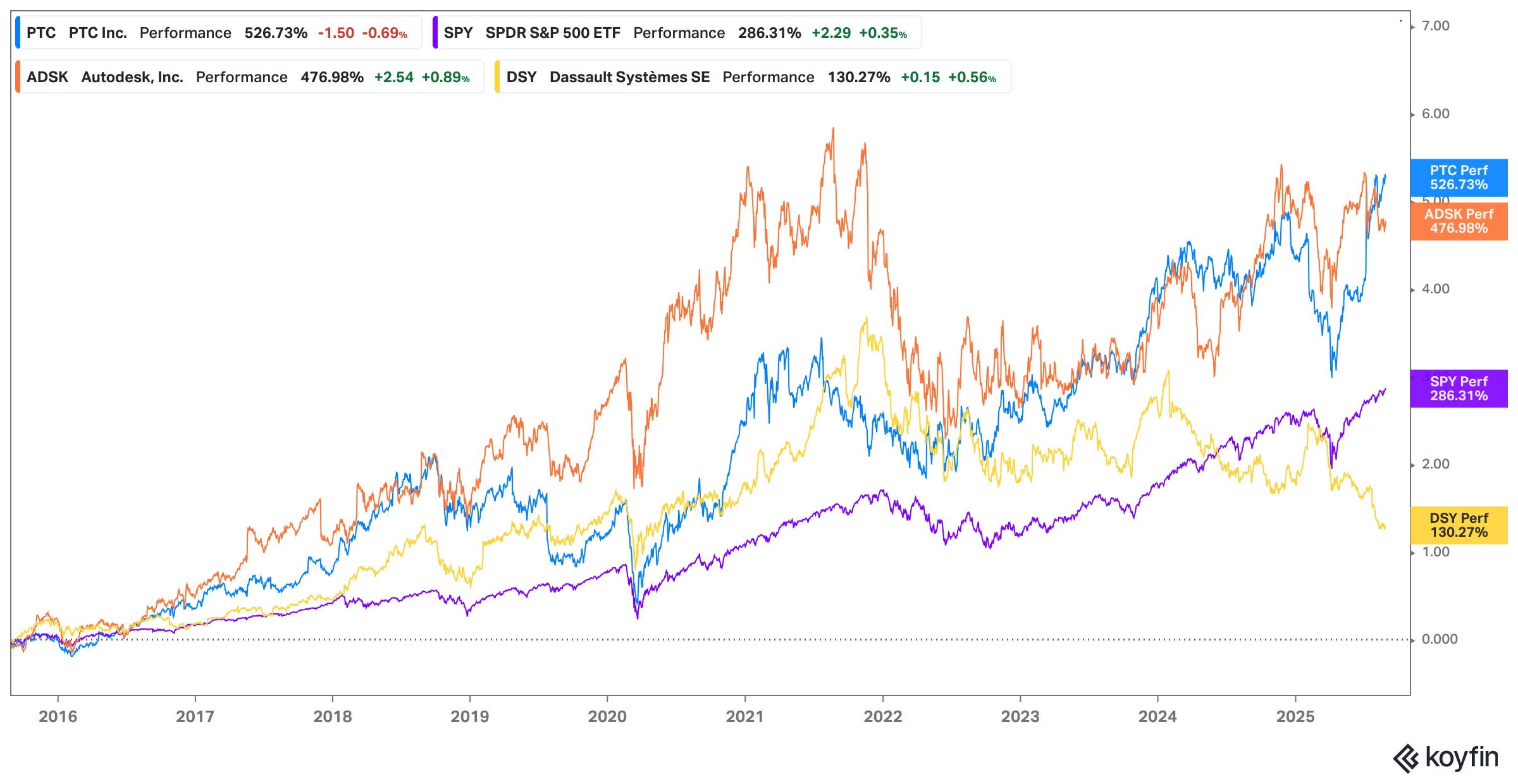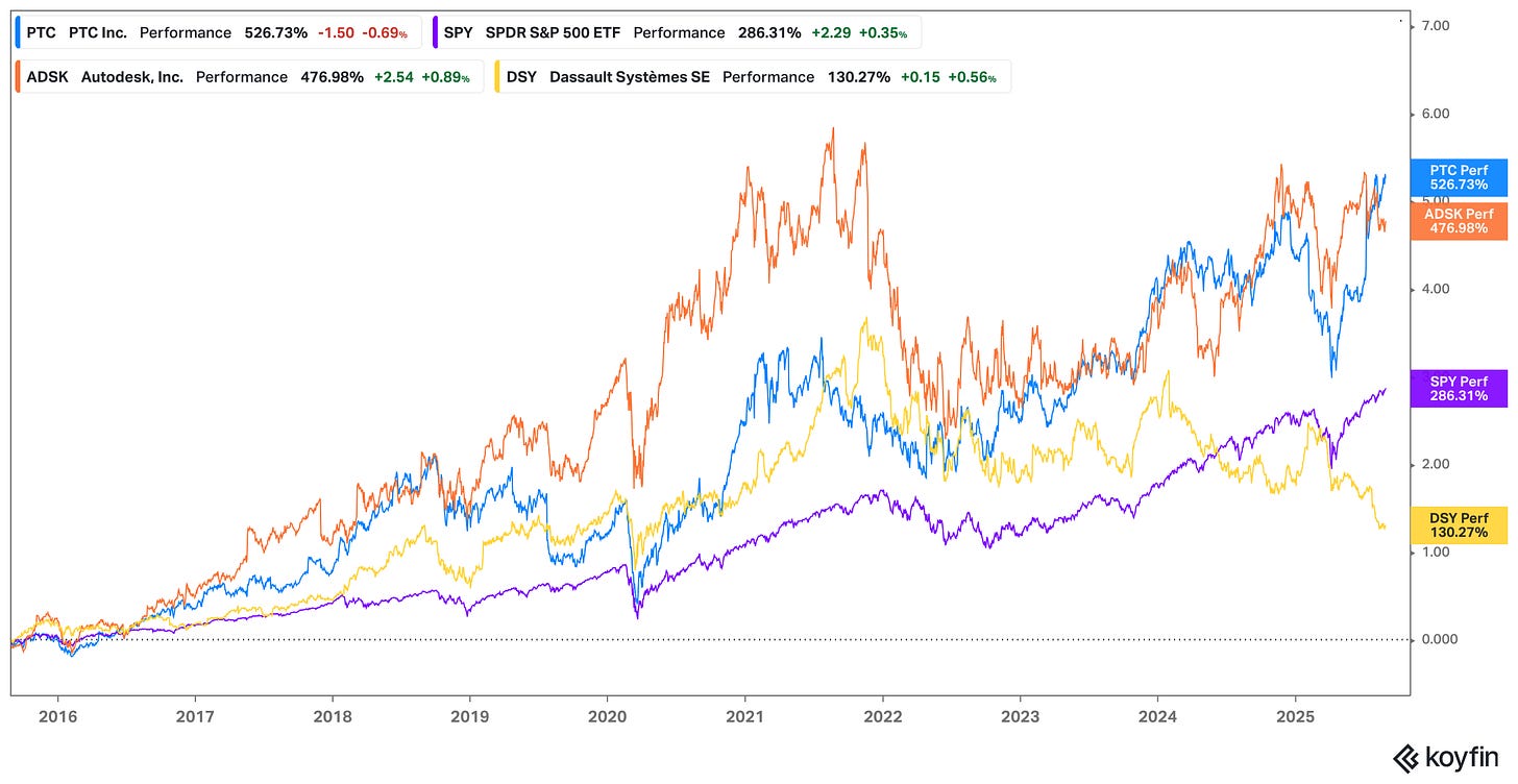 In the years I’ve been following PTC it has always remained in the shadow of Autodesk (ADSK) and Dassault Systèmes (DSY). Even today with the obvious turnaround in fortunes, investors still don’t seem to talk about it quite as much as the others - and that’s partly why I’ve decided to write this post. As recently as early April 2025 you could have bought PTC shares at a sharp discount to both ADSK and DSY as measured by price-to-free cash flow. In early July rumours began to emerge of ADSK’s interest in acquiring PTC, which caused a significant bump in PTC’s share price - curiously, with ADSK now having distanced itself from any such ambitions, PTC shares have not reverted to pre-rumour levels.
