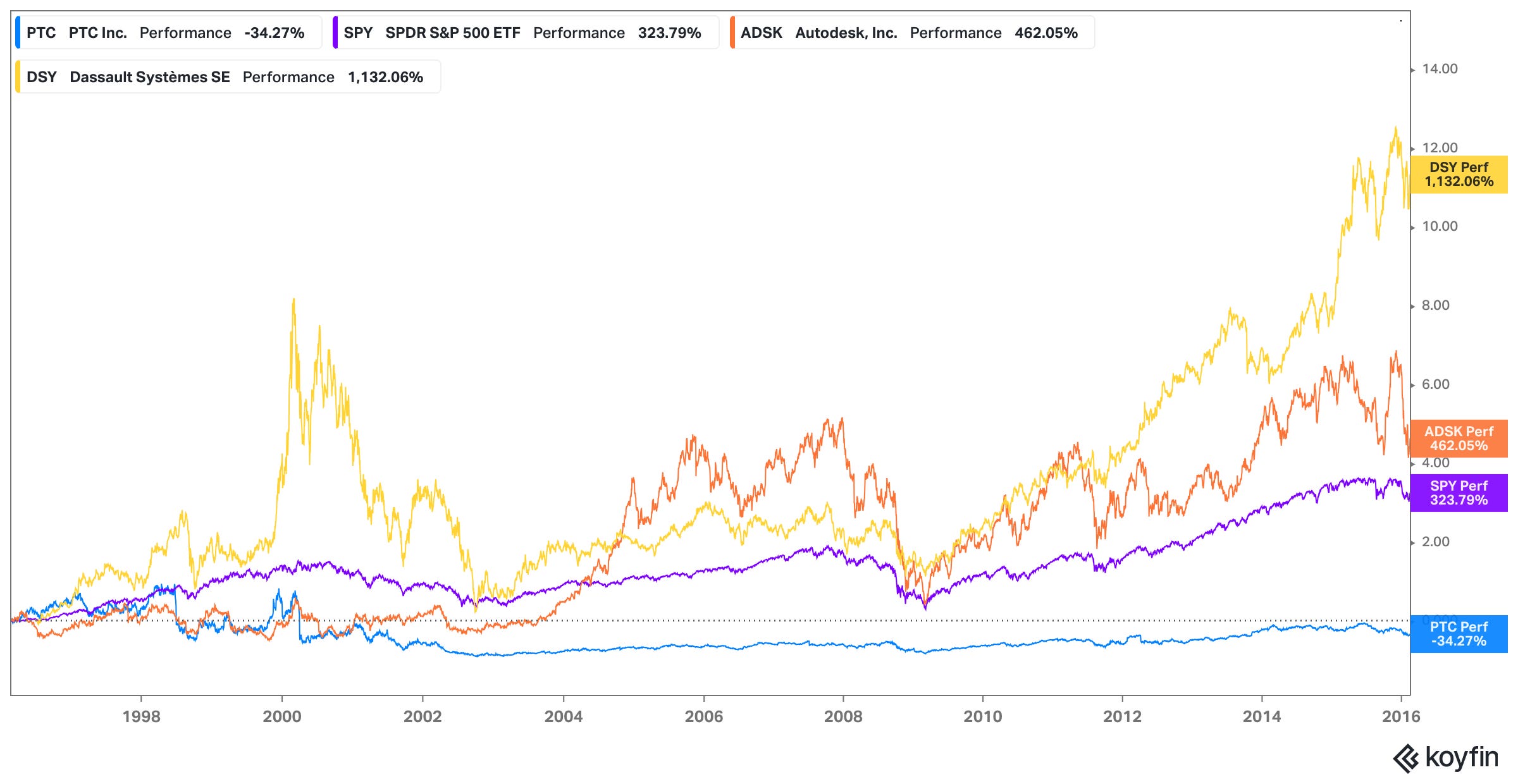 For those not yet particularly familiar, PTC is an industrial software business and a leading vendor of computer-aided design (CAD) and product lifecycle management software (PLM) to customers who design and manufacture products. 10 or so years ago PTC stock was an extraordinary dog, having underperformed its peers and market indices by an extraordinary margin over an extraordinarily long time: