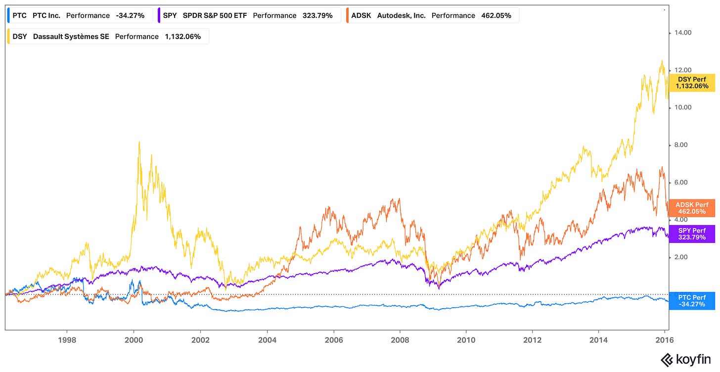 In this deep dive I’ll start by reviewing how PTC got to where it is today. Notably, PTC’s software has always been the benchmark in parametric CAD modelling capabilities (the clue’s in the name: Parametric Technology Corporation). Even during PTC’s darkest years of disruption, the company managed to hang onto a foundation of large customers who were there for those capabilities - an important indicator of the incredible stickiness of CAD software. But there are lessons too: being the best at one thing isn’t enough, even if that thing is an important one. So what I really want to talk about is PTC’s present and its future - this is the focus for Part I.