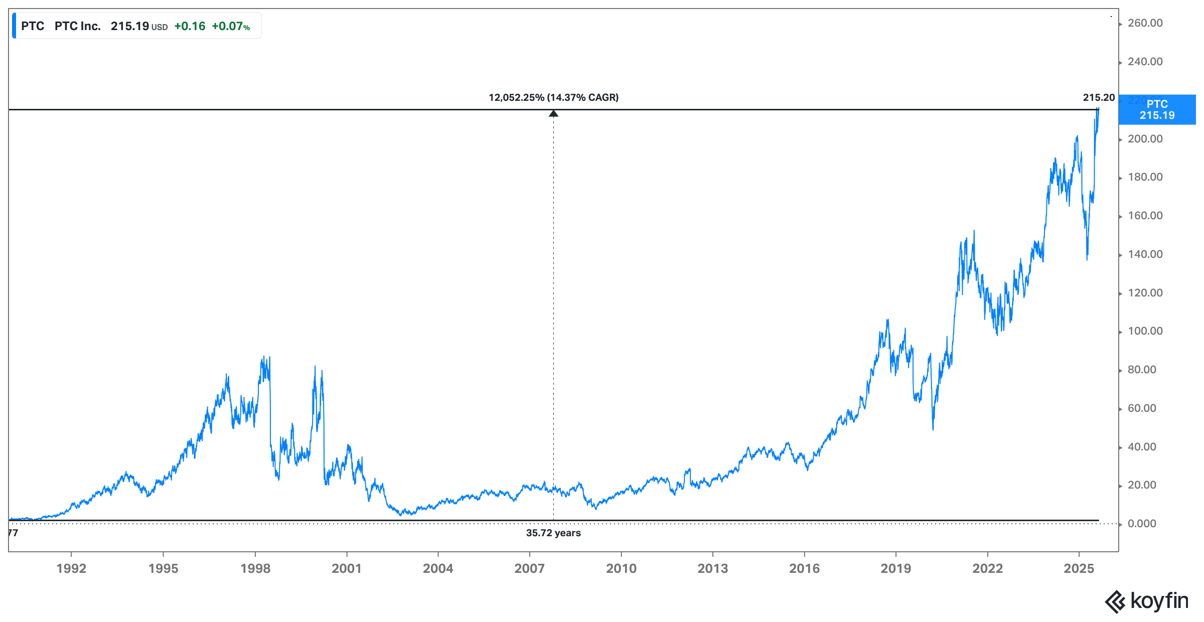 PTC is certainly a business with a bit of history and a bit of baggage - it’s not one of those beautiful compounders that has done 20% year-in-year-out since IPO. But even with 20 years spent out in the cold, PTC has still somehow compounded at more than 14%, which isn’t bad.