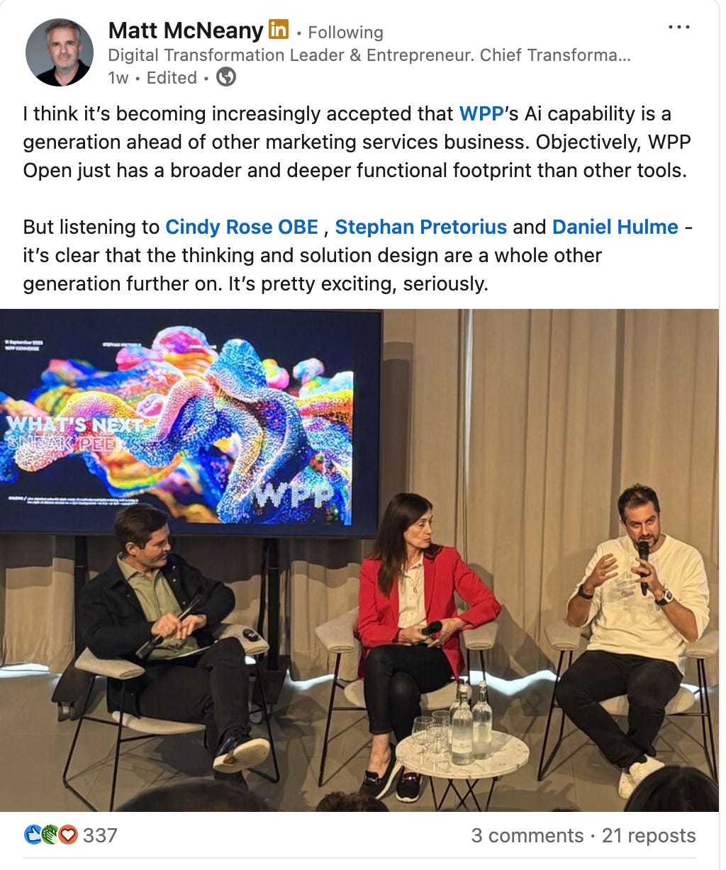 I like to dip into The Immortal Life of Agencies podcast from time to time. I listened to this episode with Matt McNeany a few months ago. He’s an adtech founder and a 20 year veteran of Omnicom, where he was most recently Chief Transformation Officer. He talks about AI and what it means for agencies today, which is why I listened to it. It’s a good episode. McNeany also mentioned that he was between jobs, but then turned up in August as President at WPP Open (WPP’s AI-powered ‘marketing operating system’) - which of itself is a curiosity. The nature of his precise venture at WPP is yet to be announced.