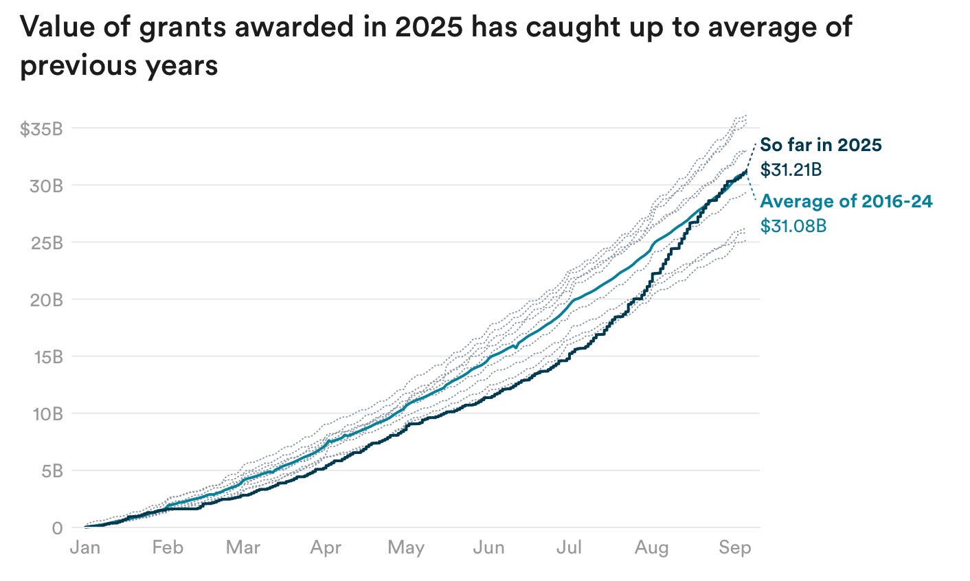 According to an analysis by STAT, there was a $8.1bn surge in awarded NIH grants in August, and the NIH now seems on track to spend its entire budget by the 30 September deadline: