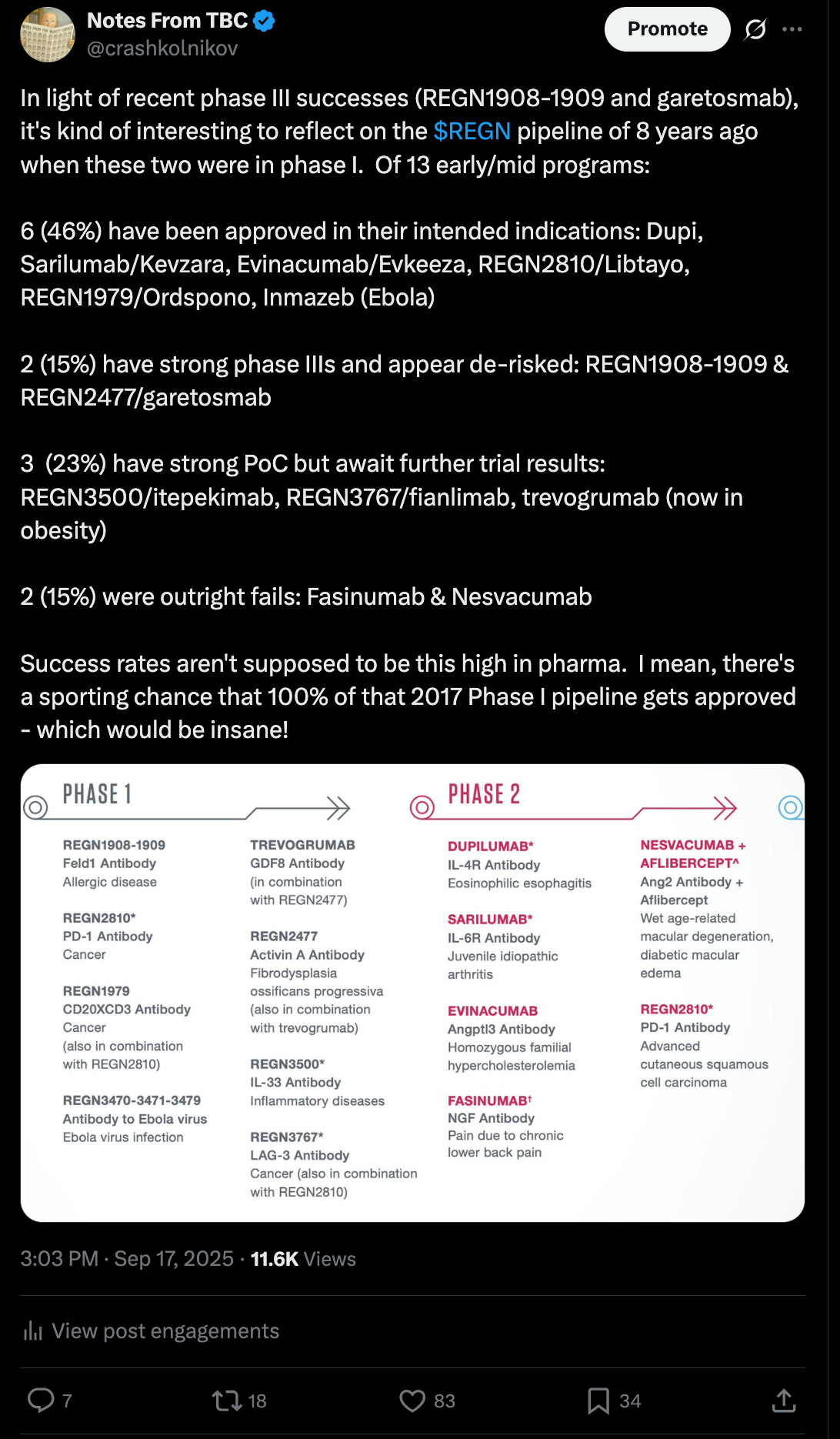 As many of you already know, the essence of the Regeneron investment thesis lies in the company’s high clinical trial success rates. The evidence is out there for anyone who wants to look at it, so it somewhat surprised me how much interest the tweet received - but it’s nice that it did.