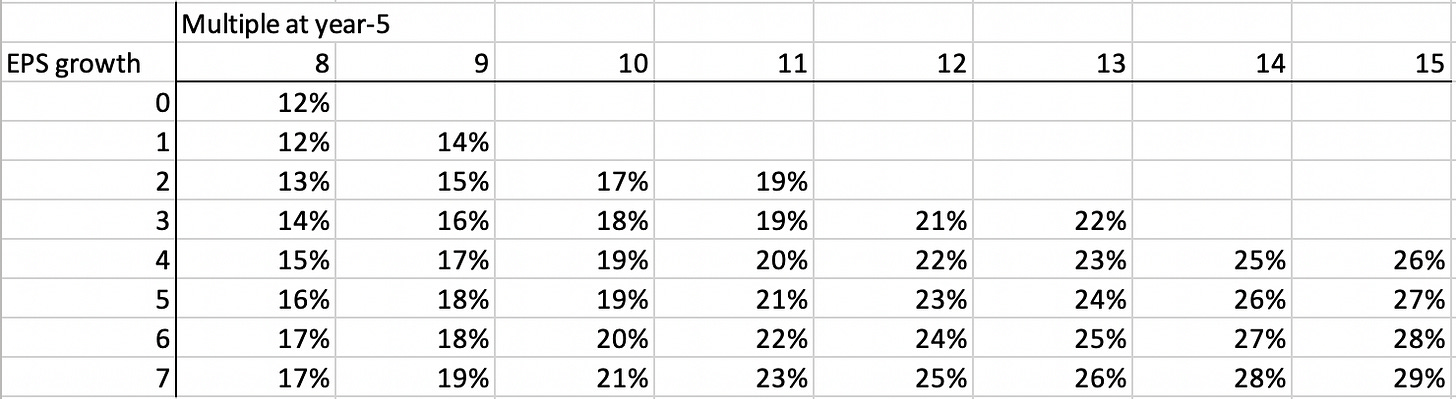 First of all, you should of course take this with a pinch of salt. For example, 12% IRR with no growth assumes all the earnings/cash are paid out, which is probably not realistic. It’s purely meant to demonstrate how interesting things can be when you get a little growth combined with multiple expansion off a low base. As to exactly where things go from here - I don’t know, but I’ll be watching. But I’m happy to take the 5.5% growth (see above) combined with a Publicis-like multiple of ~13x as a reasonable base case. Is WPP a multibagger from here? Time will tell.