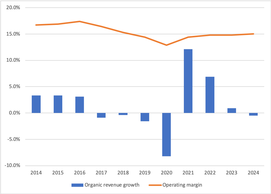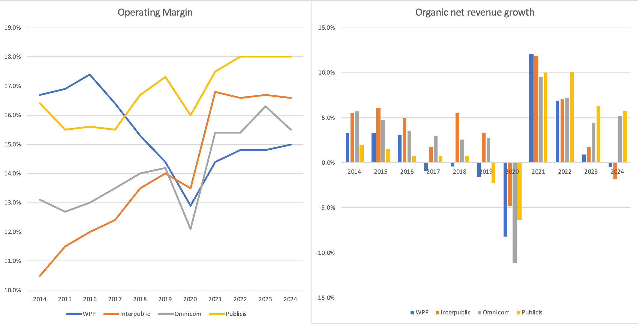 For context, it’s worth having a quick look at WPP’s holding company peers. Here are operating margins and organic revenue growth over the last decade: