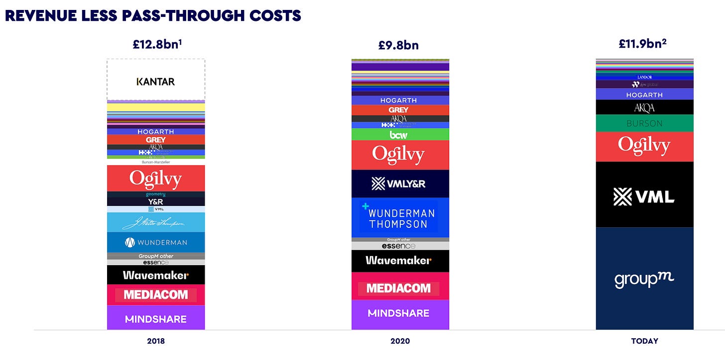WPP’s story begins in 1985, involving shopping baskets, a BMW, fish and chips and a 40 year old Martin Sorrell - the specifics aren’t important, but the curious can read about them here. Sorrell then went on a 33-year shopping spree, acquiring hundreds of businesses - he’s surely one of the most acquisitive leaders in business history. In 2018 he was ultimately deposed, in ignominious circumstances. What Sorrell left behind was a mess. Yes, some great iconic brands and capabilities, the word’s largest media agency and thousands of talented people, but a mess. There were hundreds of brands, thousands of legal entities, hundreds of office locations, dozens of IT systems and practically no integration. Moreover, through running the business too hard for margin, Sorrell had underinvested in WPP’s largest market (the US) and underinvested in employees. Multinationals were also squeezing marketing budgets due to a passing fad in zero-based budgeting. The business was indebted too. When WPP’s share price was riding high in 2017, its business was already on the turn - margins were diving and revenue growth had stopped.