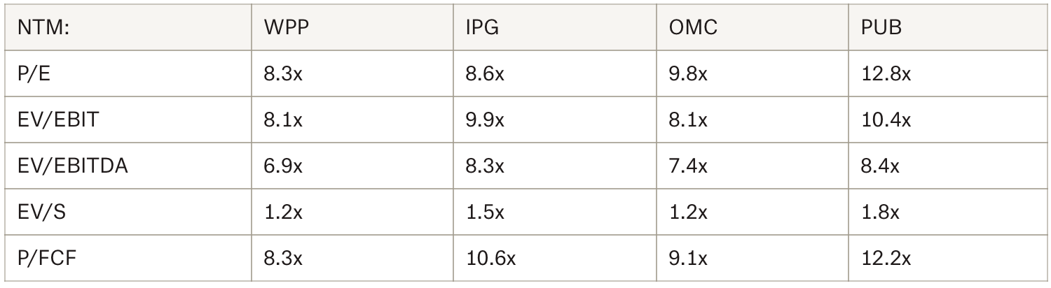 Even in a depressed sector, WPP has the lowest valuation on all fronts. But it also has the best visible prospects for margin and growth improvement. This is a potent combination in my view. Moreover, the sector itself is consolidating. If we also arrive at a situation where at least two thirds of the holding companies (PUB and WPP) are executing well, it would not then be a surprise to see the industry as a whole re-rate higher.