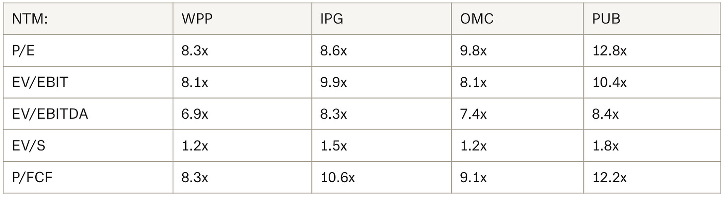 Before we move on, a quick note on technology and AI. I have already outlined the scale of WPP’s investments into AI, which compares to $80m for IPG in 2024 and €300 for PUB over three years. OMC have not provided a figure, so far as I can ascertain. With IPG and PUB investing <1% and sales and WPP investing 2-3%, it becomes easier to see that WPP’s lower margin does not tell the entire story. Last, it’s worth noting that OMC, IPG and PUB have ‘platforms’ too, but they’re more focussed on the data and consumer insights side of things, rather than a complete marketing ‘operating system’ like WPP Open, which is a unique proposition.