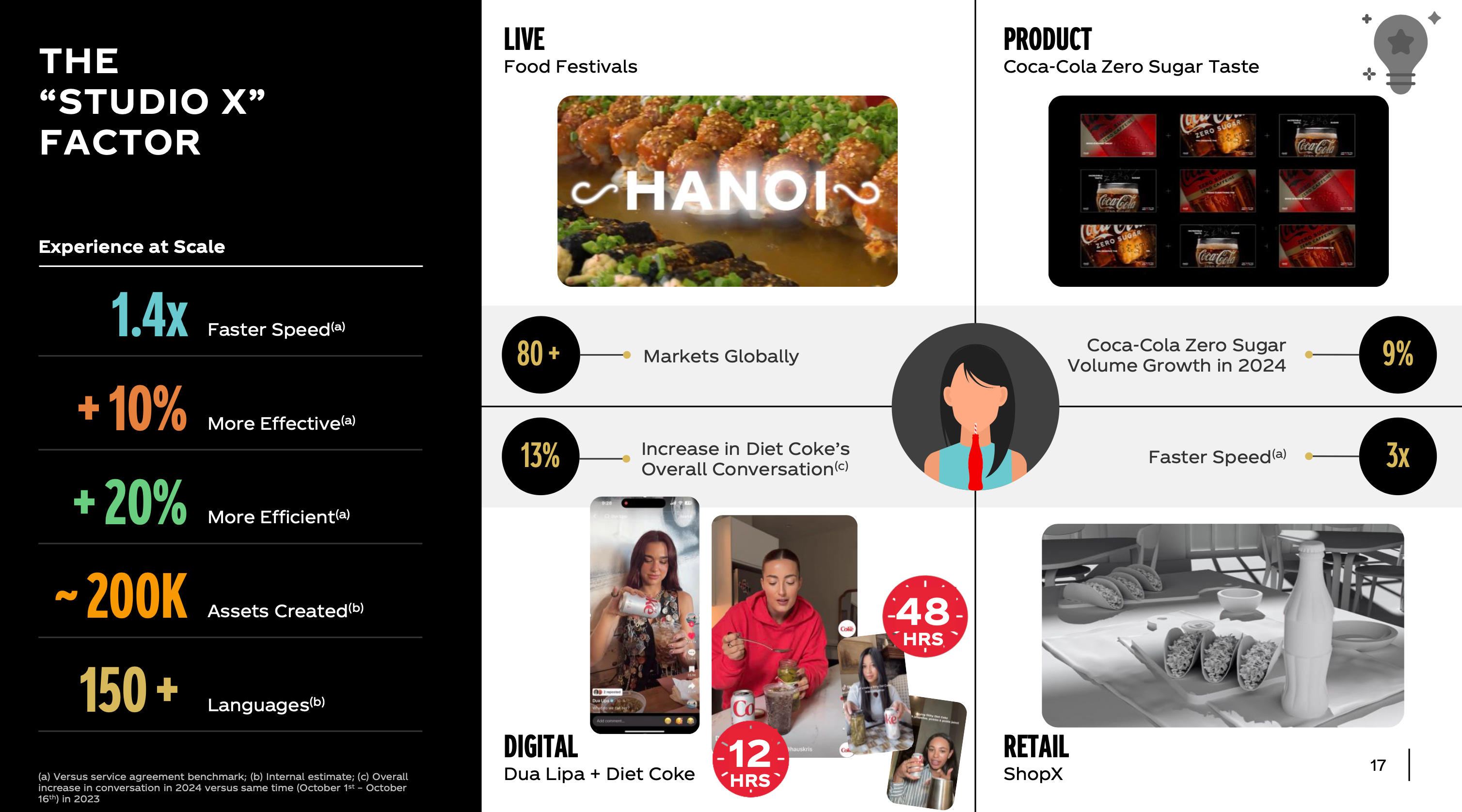 We've talked about Studio X a number of times before, but it's really been a key component in helping unlock our marketing transformation. In essence, there are nine studios around the world all interconnected, and nine, because we have nine operating units that of course are increasingly using the digital ecosystem around them to deliver experiences as they drive growth. There are not many things you can come on to the stage and talk about where you get all of the first three things on the left hand side [note: see slides below]. It has made our marketing faster from idea inception to execution. It has made it more effective with consumers and it is more efficient, i.e., cheaper. Not many things can deliver on all those three and actually come to life at scale.