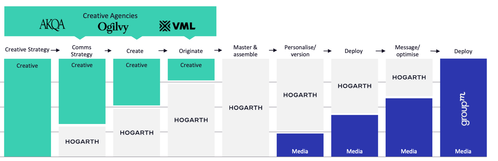 Production: Hogarth, the world’s biggest marketing production company - putting creative ideas into production. ~6,500 people. Growing high-single / low-double digits and ~5% of net sales.