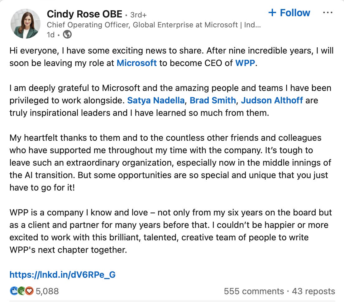 Rose, has spent the last nine years at Microsoft, most recently as COO of Global Enterprise Sales, but she has also been on WPP’s board since 2019. While I don’t know a great deal about Rose at this stage (please let me know if you have anything notable to share) - I am intrigued by the choice. WPP is, in effect, trying to reposition itself as a software and technology solutions provider, albeit alongside its more traditional creative services offering. So there’s certainly some kind of sense in having someone with deep experience in enterprise software sales and getting traction with the relevant budget people in C-suite. Moreover, having been on the board for six years, Rose has been party to all the discussions and decisions that have carried the WPP Open strategy this far. In other words, it’s looking unlikely to me that we’re going to see a pivot to the Publicis strategy or a breakup. Some version of a continuation of the WPP Open strategy, but presumably with adaptations looks like the stronger bet. I’m really curious to see where it goes.