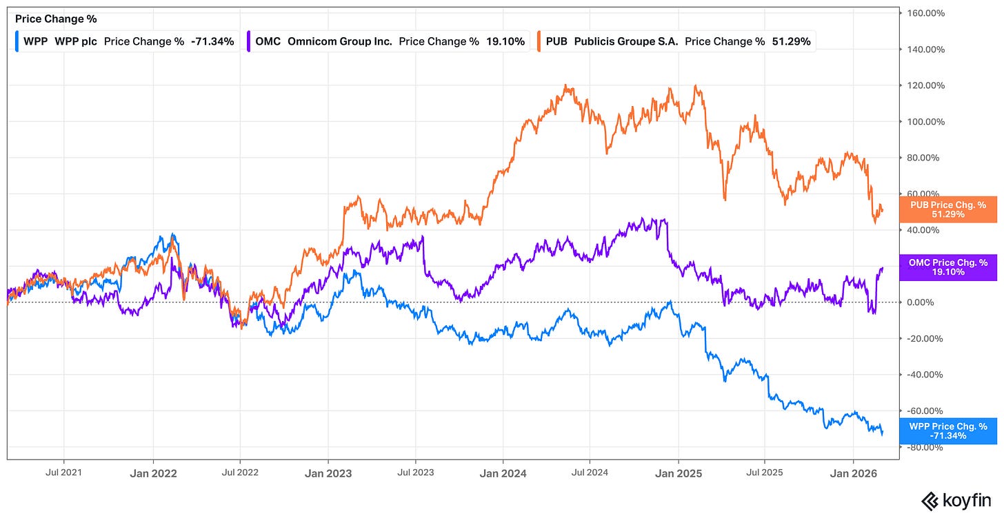 It should be fairly clear to most investors that we are still only in the foothills of whatever disruptive changes will be brought upon the world of business by generative AI. But we are already far enough in such that investors are beginning to ask questions about terminal values in those industries perceived to be losers - most notably, this includes software in 2026. But the marketing services industry was singled out as an obvious casualty even earlier on in the process. After all, what is the point of paying for professional marketing services in a world with Zuckerberg’s ‘black box’, Claude for Marketing, Veo and Pomelli.