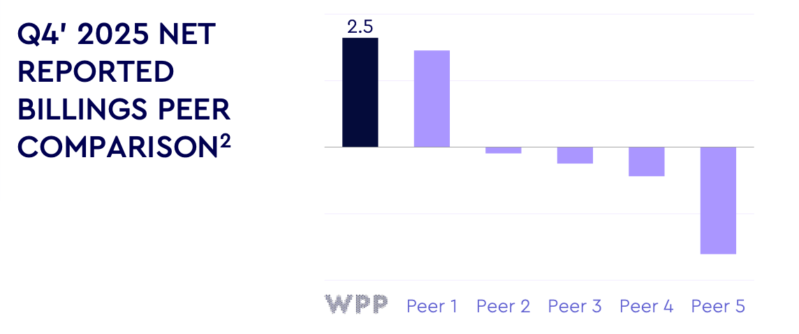 In the end, pitch performance started to turn around dramatically starting from August 2025 with the Mastercard media account, followed by Reckitt and Henkel in November and the UK Government and Jaguar Land Rover in December - among others. And this has continued into 2026 with SC Johnson and Norwegian Cruise Lines in January and Estée Lauder in February. Per JP Morgan estimates (cited by WPP), WPP had the strongest billings quarter among all of its peers in Q4 2025: