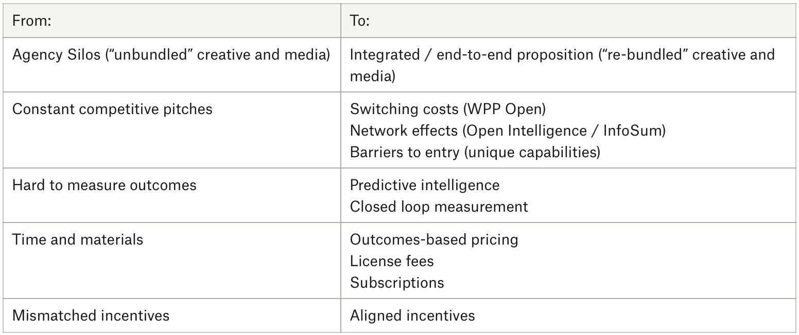 About a decade ago Publicis’ previous CEO announced a new strategy called The Power of One - a strategy that his successor Arthur Sadoun has pursued relentlessly and very successfully. The basic idea was to break down the traditional agency company silos and be able to offer clients more integrated and holistic solutions - all while hanging onto many of the individual agency brand names. Get it right and you can re-bundle3 creative and media, drive better client outcomes and win pitches more consistency. It’s worked fantastically well. Mark Read actually, in many respects, set off in a similar direction - OpenX is a successful example of this. But he never quite managed to land the strategy into a winning proposition that could consistently win in pitches - we discussed the data part earlier, but what else did he get wrong?