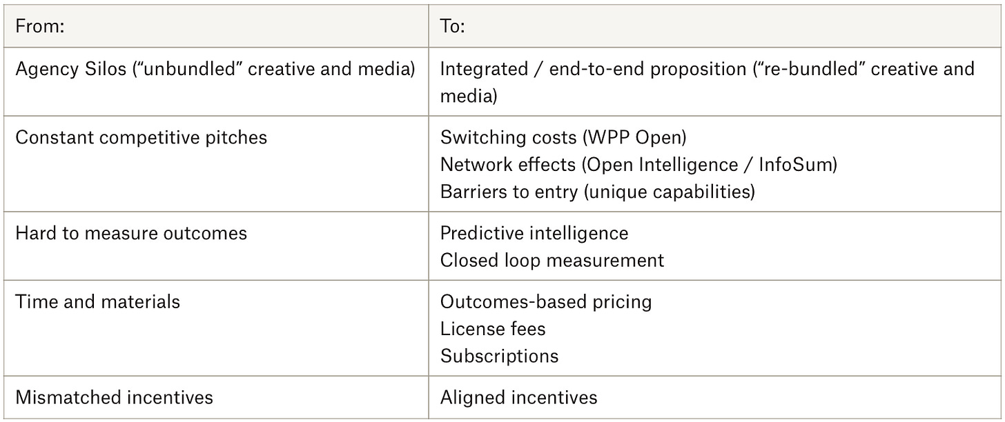 Client growth was a topic that came up a lot in WPP’s latest investor presentation - much more than in the past. And it’s an important point. Brands haven’t been growing as fast as they used to and you have to ask if part of the reason is the time-and-materials model that does away with upside capture. Upside capture kills two birds with one stone: 1) aligned incentives: WPP wins when the client wins and 2) it solves for the time-and-materials problem in the world of AI. In 2024 this was the vision, whereas in 2026 they’re pushing it as the reality. So here we come to the crux of it all: is WPP now in a strong enough position to be able to pitch client outcomes linked to outcomes-based pricing?