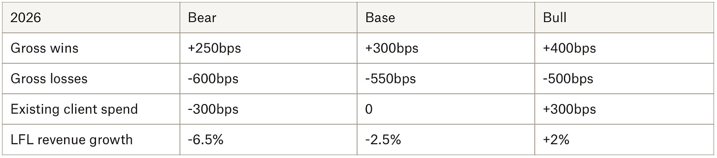 There are other considerations too. First, for 11 out of 12 months in 2025 there were four major holding companies until Interpublic was engulfed by Omnicom in November. Not only will there be significantly reduced competition in pitches, but it’s hard to imagine Omnicom being able to fight its best game during a year of heavy integration work. Second, perhaps the big swing factor for 2026 will be existing client activity. Given guidance (gross losses 500-600bps and >250bps of gross wins already baked in), we can start to think about scenarios: