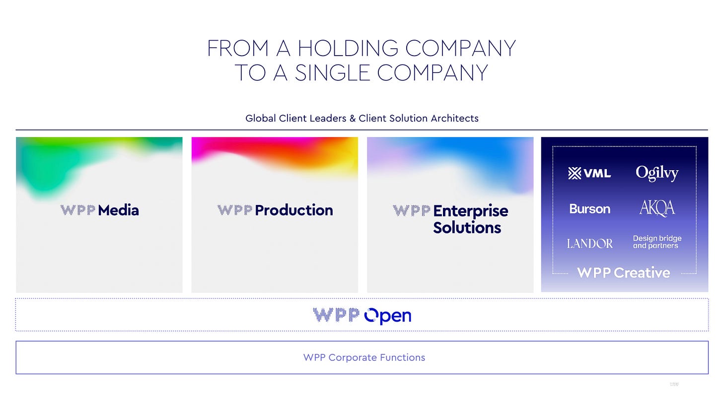 On structure, the main change to call out here is the creation of WPP Creative which unifies the various creative agencies into single regional P&Ls with more shared corporate function - all while maintaining the individual identities. Per WPP, the simplified corporate structure allows for new common incentives: