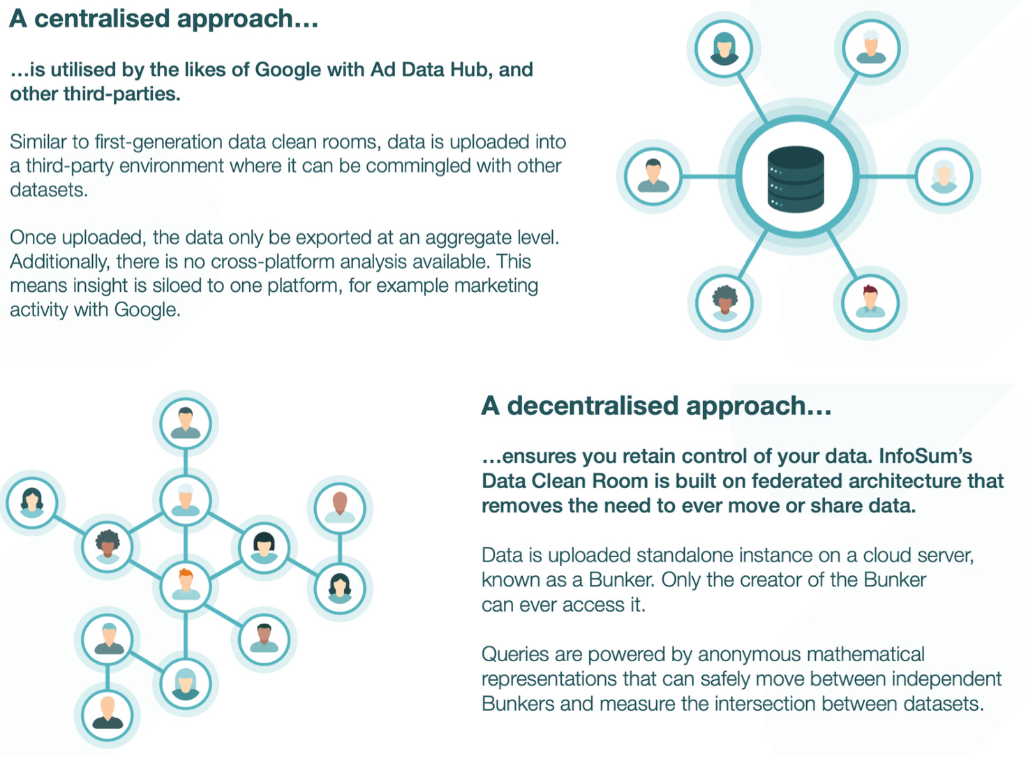 And because data is never moved, it makes InfoSum much faster to onboard and to use both from the perspective of data extraction and upload and from a contracting perspective. According to InfoSum CEO Lauren Wetzel, clients save 156 days on average with InfoSum, seven times faster than other platforms - while I havenāt audited these claims, it is easy to recognise how a decentralised platform could be a lot faster logistically.