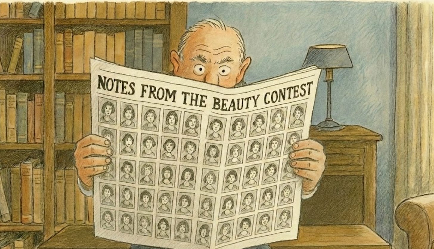 Before we get to that I thought it might be interesting to begin with a discussion of NFTBC itself - some of the learnings so far and thoughts about future direction. In early 2025 I found myself suddenly out of work, having previously been an analyst with a global large cap fund for many years. Perhaps a story for another time. But rather than looking for another job, I decided to start Notes From the Beauty Contest, named after Keynes’ analogy of the newspaper beauty contest - which I took to be the central dynamic at play in equity markets at that time. You can read what I wrote here, but the basic point is captured in these words: