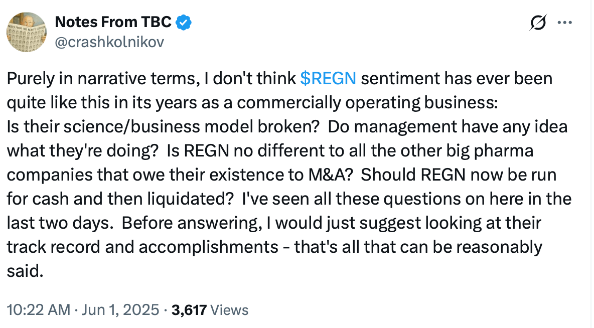 When I published the deep dive at the start of February, I was excited about REGN’s valuation and future prospects, but uncertain about what might transpire in 2025 with the entry of Eylea biosimilars. I mused that REGN shares could drop another 25% before reaching the bottom - just like they did during the last Great Eylea Scare of 2019. In the event, they dropped 28%, although not entirely due to events I had foreseen - instead, persistent delays to important supplemental approvals of Eylea HD in the US due to regulatory issues with REGN’s third party filler (Catalent). REGN’s market cap plunged close to $50bn in June - making for an absurdly low enterprise value once you include net cash of approximately $15bn.